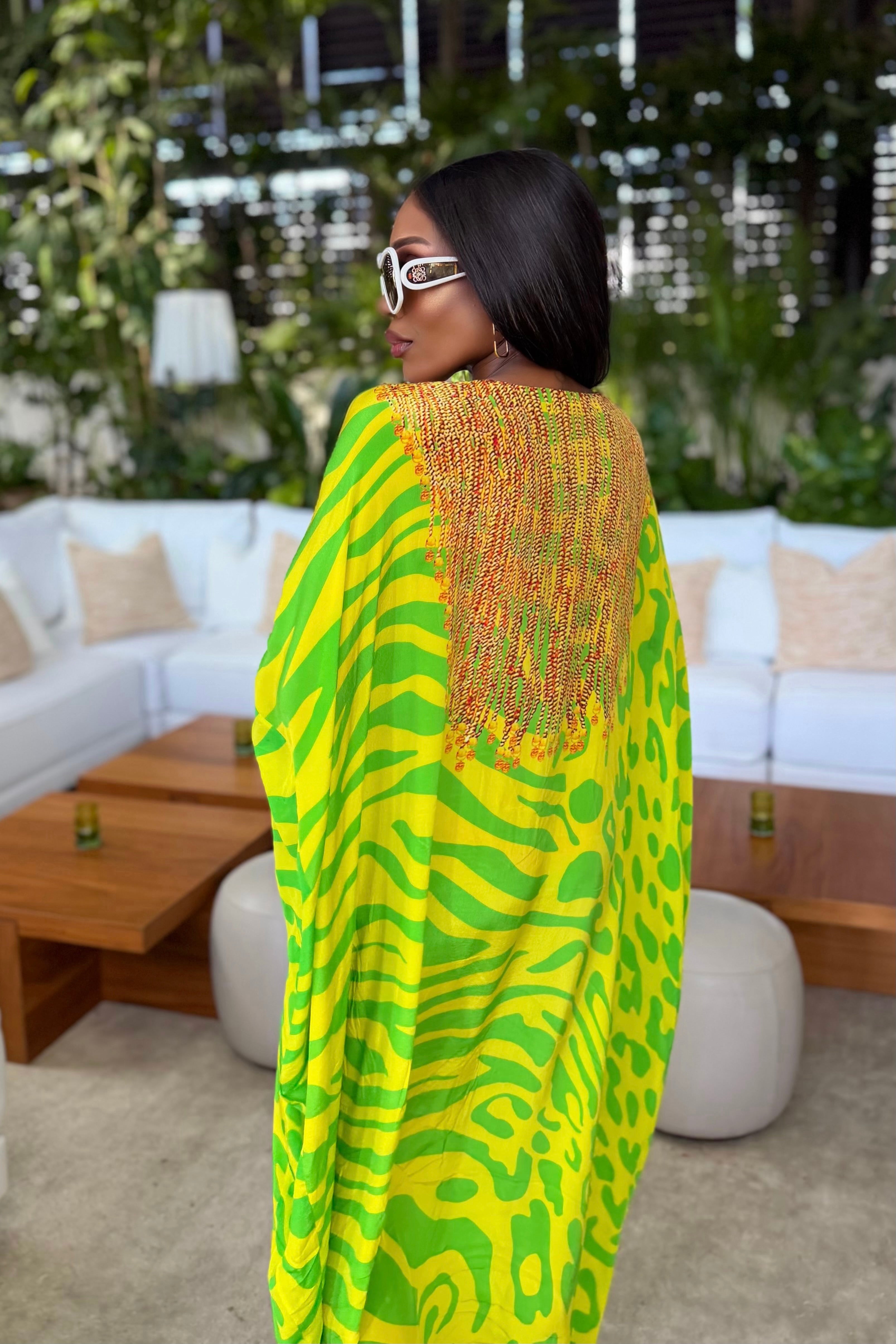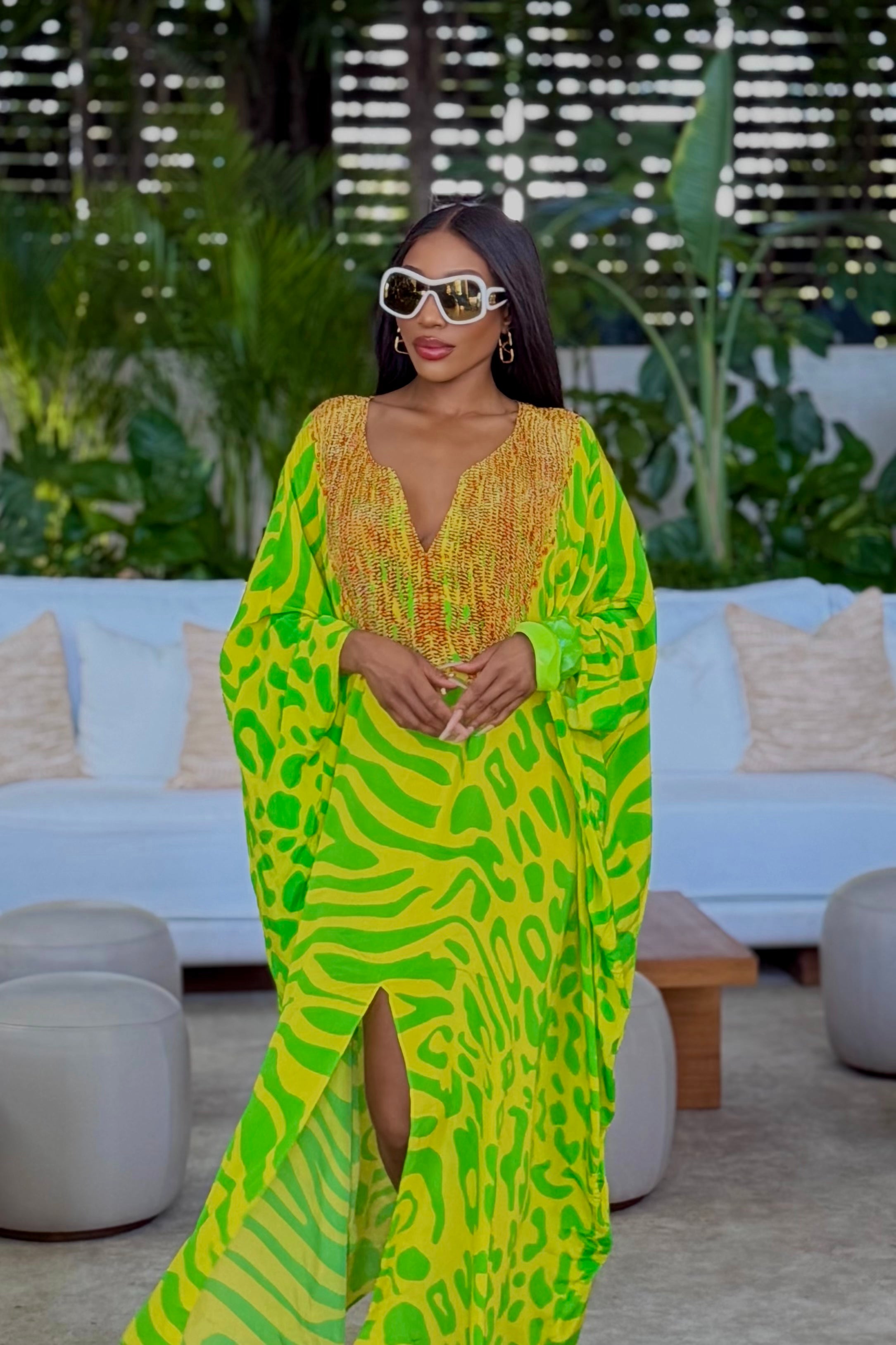 As the wife of the mayor, Nyakomi is always finding herself attending local events alongside her husband, but she has found a way to create her own identity, separate from just the mayor’s wife. She is a very generous woman who loves giving back to her Texas community. Nyakomi participates in several local charity events and has established three charitable organizations. Nyakomi takes pride in her work and also takes pride in her beautiful family. Family time is something she cherishes. Every summer, she, along with her husband and three children, take a cruise in the islands somewhere. This year, they will be cruising through the Greek Islands, where Nyakomi will be looking fabulous in her v neck green and yellow print kaftan.