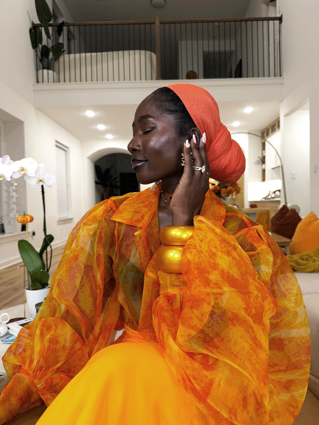 A statement in motion. The Orange Bloom Blouse floats in sheer, sunset-toned fabric with dramatic balloon sleeves that command attention. Lightweight yet luxurious, it catches every glimmer of light — perfect for the woman who believes elegance should feel effortless. Pair it with our matching pencil skirt or denim for a bold, head-turning moment.