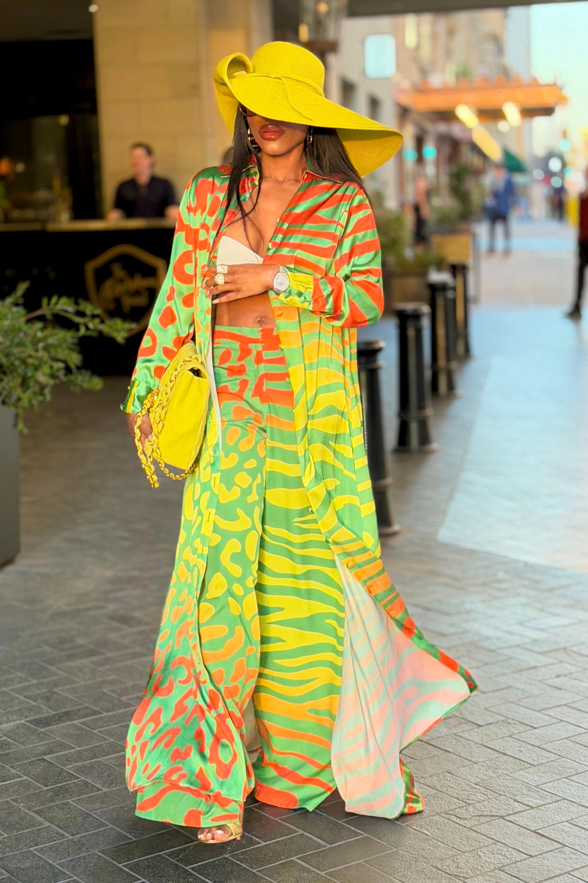 The Memi Pants balance vibrant citrus tones with clean, elongating structure. The wide-leg silhouette flows with intention, creating movement that feels both relaxed and refined.