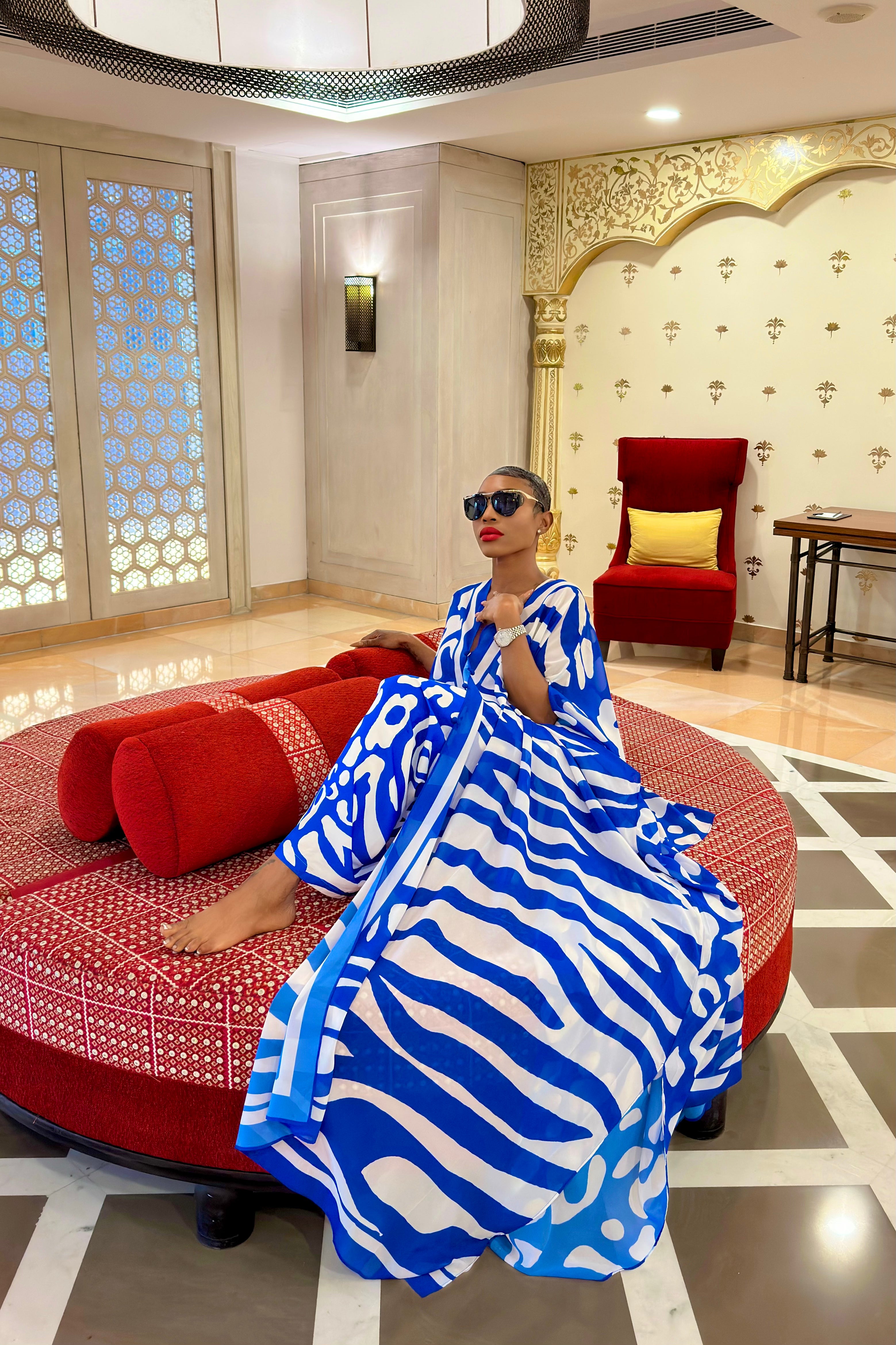 If you're seeking a bolder statement, the Sandra Goddess Kaftan offers a striking blue and white animal print, embodying fearless fashion for the modern traveler. Its flowing silhouette ensures comfort without compromising on style.